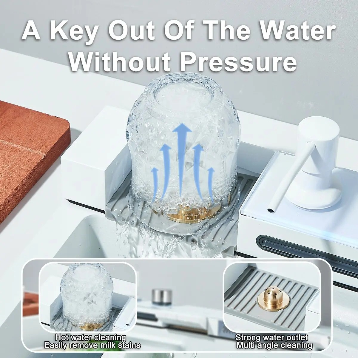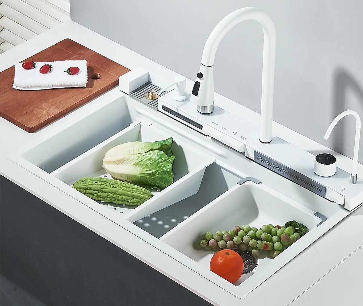 Chiuveta Multifuncționala Premium, din Oțel Inoxidabil cu 2 cascade, jet spalare pahare, tocător din lemn natural și 2 cuve pentru spălat, Alb mat